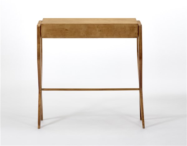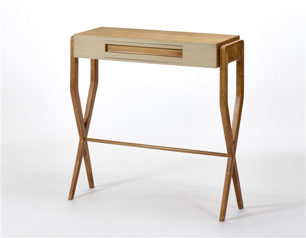 Console with X-shaped fork uprights joined by a horizontal crosspiece, in front of a grissinated and white lacquered drawer. Milan, 1940s/1950s. Solid wood and maple veneer. (100x98.5x35 cm.) (slight defects and restoration)
