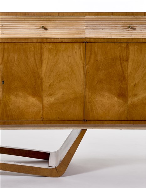 Grande credenza impiallacciata in legni diversi composta da due corpi parallelepipedi intersecati retti da un sostegno a slitta e puntoni e da un puntale a sezione triangolare. Fronte a tre cassetti sottopiano, due ante laterali con fronte grissinato in legno chiaro, quattro ante impiallacciate in legno con venatura disposta a macchia aperta. Pomoli dei cassetti in fusione di ottone. San Paolo del Brasile, anni '50. Recante sullo schienale etichette cartacee della dogana in valuta brasiliana. (cm 300x93x53) (difetti e restauri)