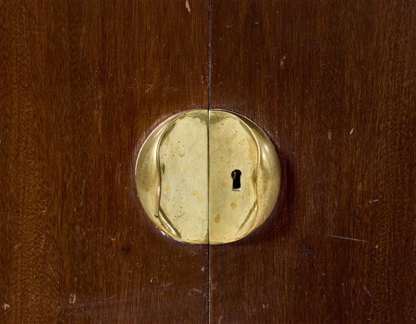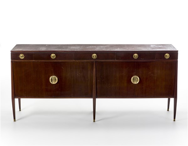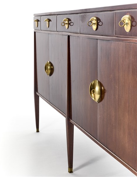 Credenza con cinque cassetti nella fascia superiore e due stipi ad ante. Milano, 1939. Legno di mogano massello, impiallacciato e bordato; maniglie in fusione di ottone. (cm 201x90x45,5) (difetti e restauri)