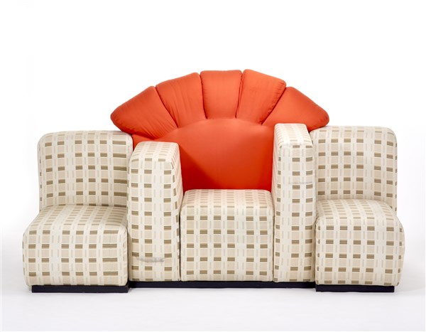 Divano modello "Tramonto a New York". Produzione Cassina, Meda, 1980. Rivestimenti in tessuto rosso per lo schienale-sole e in tessuto crème a riquadri nei toni del beige per le sedute-grattacieli. (cm 232x128x102) (piccole modifiche e difetti)