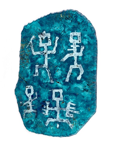 Pannello in cristallo di forte spessore con bordi scalpellati decorato con smalti policromi a soggetti stilizzati. Produzione Fontana Arte, Milano, anni '50. Firmato "DUBE' * FONTANA ARTE*". (cm max 92x66) (lievi difetti)