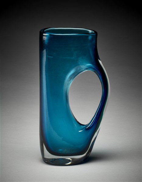 Vaso della serie "Forati" o "Buchi". Venini, Murano, 1951ca. Forma corrispondente al disegno 4514 del catalogo di fornace. Vetro soffiato composto "oceano" (cristallo, verde e blu). Corpo a un ansa e sezione schiacciata. Firmato all'acido sotto la base "venini murano ITALIA". (h cm 27,5)