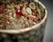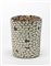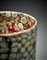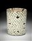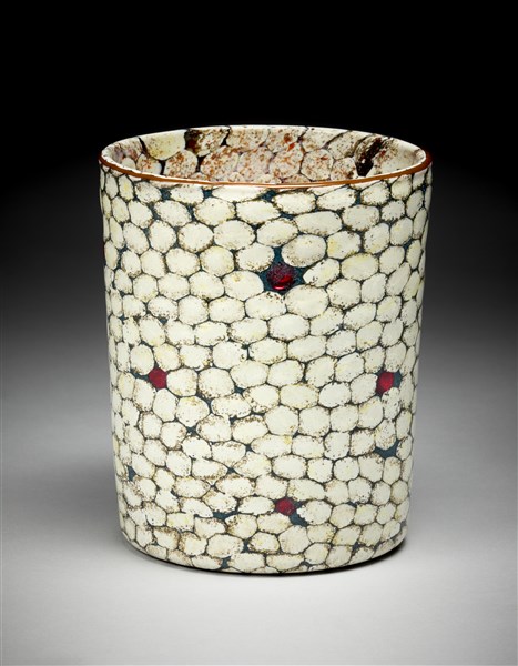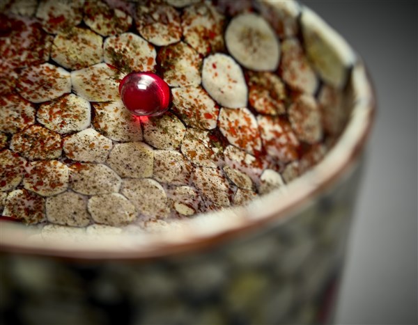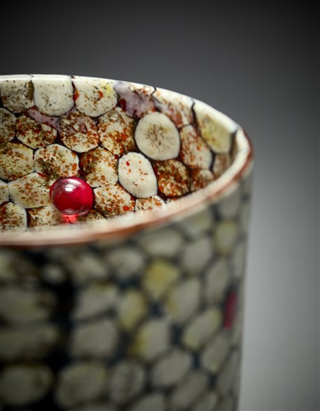 Vaso cilindrico a murrine con polvere. Esecuzione Livio Serena, Murano, 2001. Vetro soffiato con murrine esagonali lattimo e con inserti di polveri grigio-beige. Murrine rosse trasparenti sporgenti sulla faccia interna del vaso. Orlo in vetro rosso opaco. Pezzo unico. Firmato e datato a punta sotto la base "Yoichi Ohira, m° L. Serena, 1/1 unico, Giovedì 01.02.2001, Murano", monogramma dell'artista. (h cm 18; d cm 15)