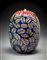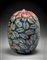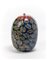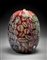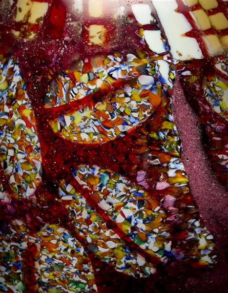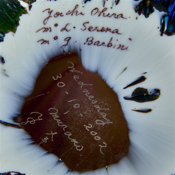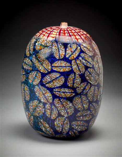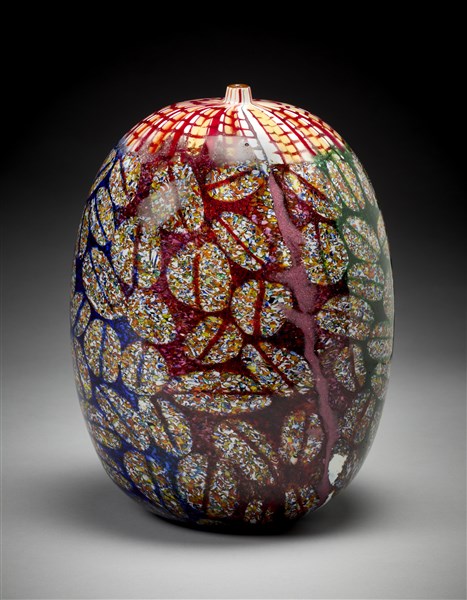 Grande vaso ovoidale con colletto troncoconico. Esecuzione Livio Serena e Giacomo Barbini, Murano, 2002. Vetro soffiato dalla complessa tessitura vitrea a strati sovrapposti. Corpo in vetro trasparente blu, verde e ametista con inserti di polveri su fondo a piccole scaglie policrome, parte sommitale a canne con murrine quadrate lattimo su fondo rosso e inserti di polveri. Orlo in vetro opaco rosso. Pezzo unico. Firmato e datato a punta sotto la base "Yoichi Ohira, m° L. Serena, m° G. Barbini, Wednesday, 30-10-2002, Murano", monogramma dell'artista. (h cm 28,5)
