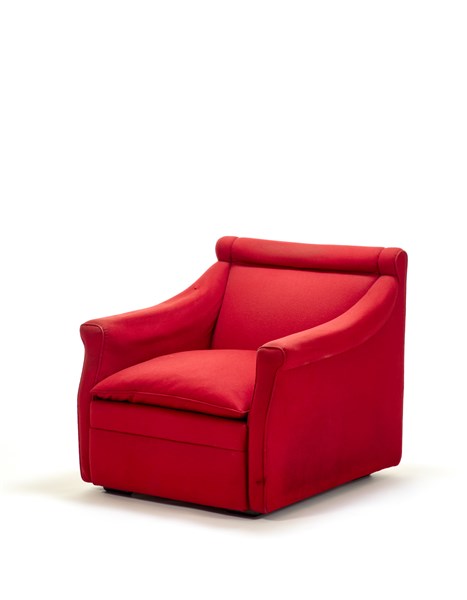 Poltrona modello "P16 San Siro". Produzione Azucena, Milano, disegno del 1967, esemplare della metà degli anni '80. Rivestimento in tessuto in panno rosso. (cm 80x74x80) (difetti)