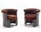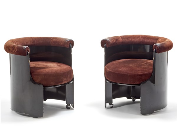Coppia di poltroncine su rotelle. Produzione Azucena, Milano, metà anni '80. Scocca in legno verniciato nero, rivestimento in pelle scamosciata marrone. (cm 74x75x72) (difetti)
