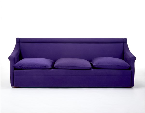 Divano a tre posti modello "P16 San Siro". Produzione Azucena, Milano, 1967. Rivestimento in panno viola. (cm 203x73x80)