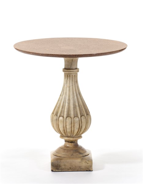 Tavolino ready made con colonna antica a balaustro scanalato in marmo venato bianco e piano in graniglia di marmo rosso/rosato. Milano, 1952-1955. (h cm 80; d cm 74) (difetti e restauri alla base)