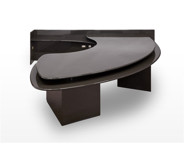 Grande scrivania dirigenziale con doppio piano curvilineo, due cassettiere laterlai a quattro cassetti della serie "Sciabola". Produzione Azucena, Milano, metà anni '80. Legno laccato color fumo di Londra. Esemplare speciale su disegno. (cm 290x80x292) (difetti)