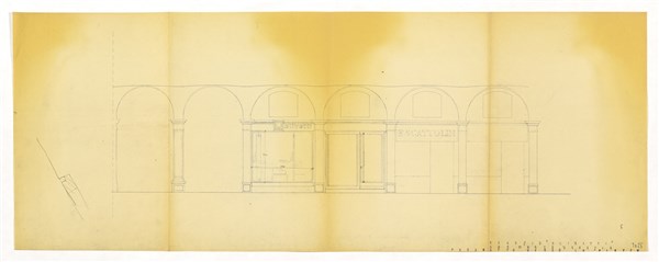 Heliocopy with main elevation of the project presented in the Municipality in April 1957, with measurements of the showcase and unidentified sketch. Venice, 1957. (41.3x109.2 cm.)