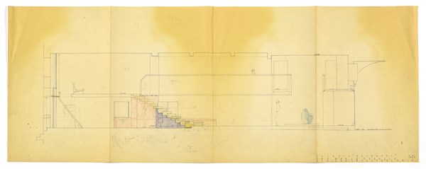 Longitudinal section with heliocopy studies of the project presented in the Municipality in April 1957, for the staircase and for the service space facing the canal. Venice, 1957-58. Heliocopy; graphite and yellow, purple and red pastel on paper. (42x109.8 cm.)