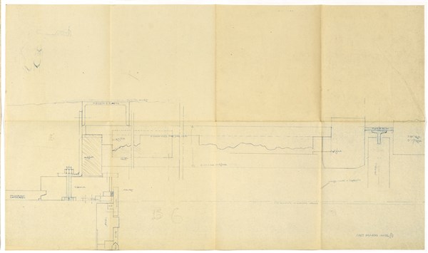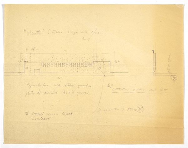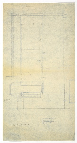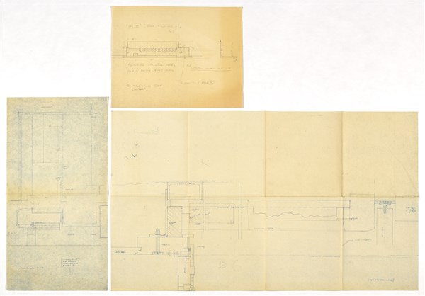 Lot consisting of a heliocopy of a drawing with notes by Scarpa representing a radiator cover in Aurisina stone under the square display case towards the Cavalletto court; a heliocopy of a collaborator of Carlo Scarpa with the study for the covering of the central pillar; a heliocopy of a collaborator of Carlo Scarpa with the study in plan for the arrangement of the stones in the right wall of the atrium. Venice, S.D. [1957-58 ca]. Heliocopy; graphite on paper. (cm 30x38.3; cm 56.5x29.5; cm 52.1x89)