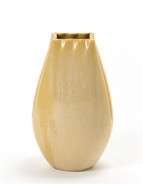 Vaso modello "5513". Manifattura Lavenia, Laveno, anni '30. Ceramica formata a colaggio smaltata in giallo "sgocciolato". Marcato sotto la base con il simbolo grafico della manifattura e con i numerali 8-53. (h cm 32)