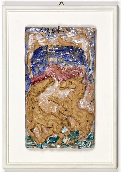 Formella in ceramica modellata a mano a rilievo con due cavalli rampanti su fondo dipinto in verde, arancio, rosso e blu. In cornice. Firmata. (cm 25x14)