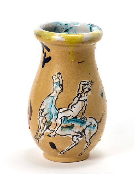 Agenore Fabbri Vaso in ceramica con decoro di cavallo e cavaliere su fondo ocra.
