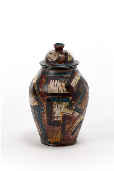 Potiche in ceramica smaltata opaca in policromia con soggetto informale. Albisola, prima metà degli anni '50. Firmata sotto la base "MGA". (h cm 23) (lievissimi difetti)