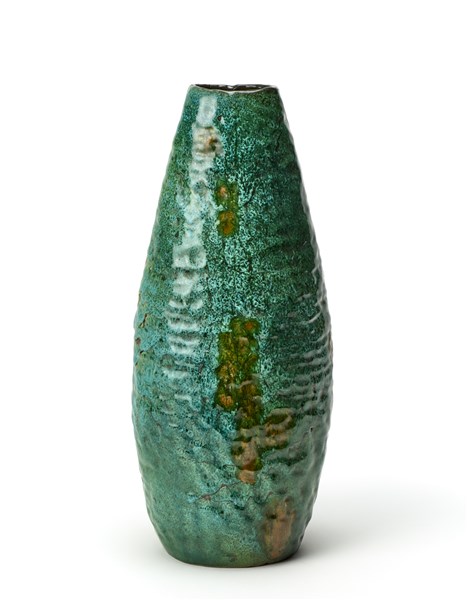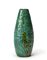 Grande vaso con corpo a superficie corrugata, in ceramica smaltata in verde a macchie rosse. Bologna, 1957. Firmato e datato sotto la base. (h cm 44)