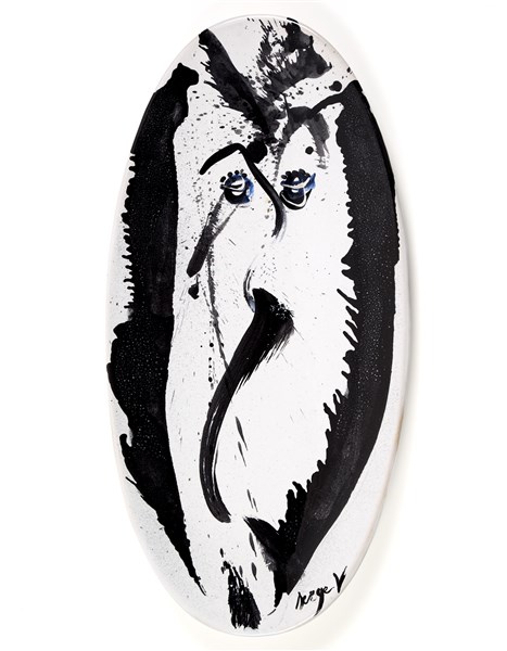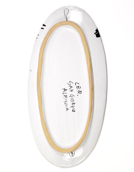 Large oval underglazed ceramic in black and blue on a white background, decorated with an anthropomorphic face. Manufacture of Ceramiche San Giorgio, Albisola, 1950s. Signed lower right. On the reverse, signature of the manufacture. (57x28 cm.)