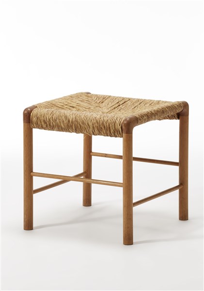Sgabello basso. Chiavari, anni '40. Legno massello, seduta impagliata. (cm 43x43x43) (restauri)