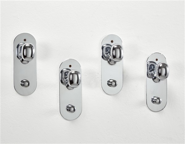 Lotto di quattro appendiabiti modello "Super". Produzione Azucena, Milano, disegno del 1962, esemplari della metà degli anni '80. Ottone cromato. (h cm 20) (lievi difetti)