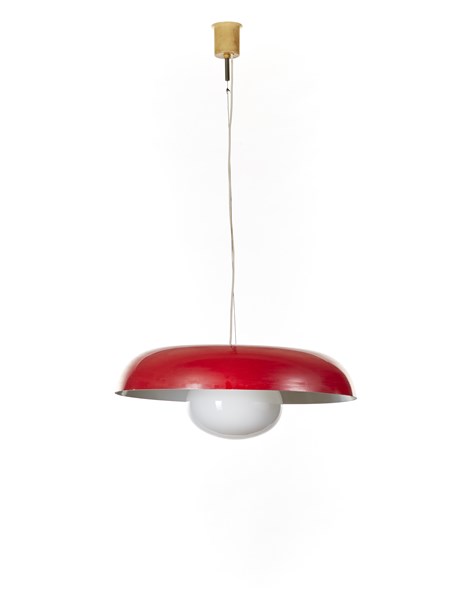 Suspension lamp with lampshade in white and red painted metal, diffuser in lattimo glass. Italy, 1960s. (d 51 cm.) (slight defects and small losses)