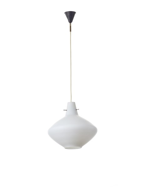 Suspension lamp with incamiciato glass diffuser lattimo acid etched on the external surface. Italy, 1950s/1960s. (d 36 cm.) (defects)