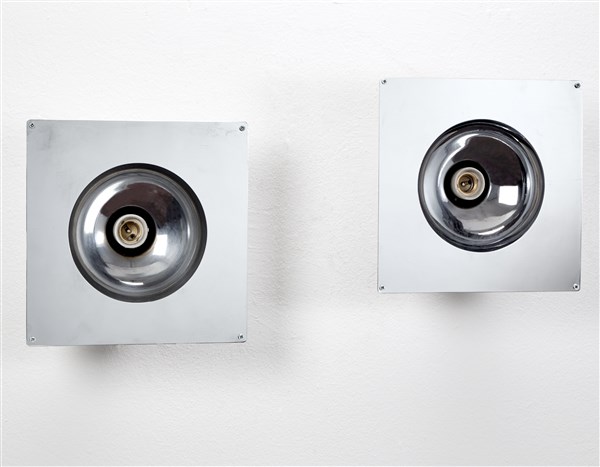 Coppia di lampade a plafone da incasso. Produzione Azucena, Milano, metà anni '80. Metallo cromato. (cm 30x30) (lievi difetti)