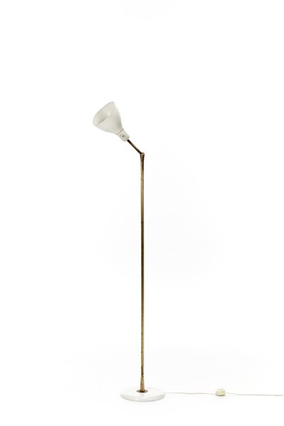 Lampada da terra. Produzione O-Luce, Milano, anni '50. Fusto in ottone, base in marmo bianco, paralume in alluminio laccato bianco. (h cm 150) (lievi difetti)