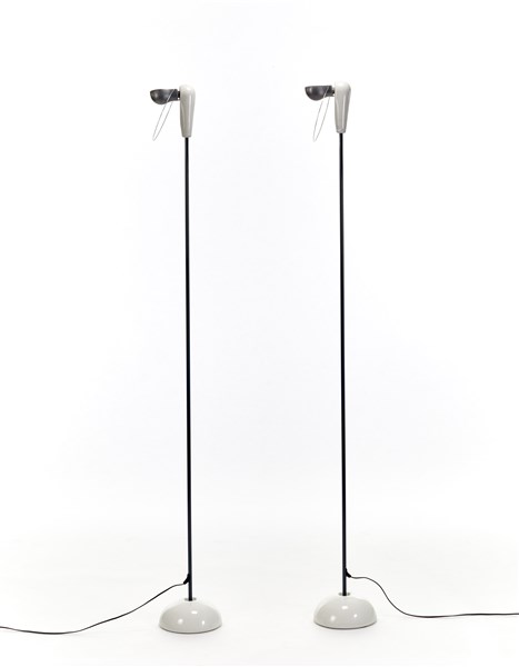 Coppia di lampade da terra modello "Bibip". Produzione Flos, Milano, 1976. Riflettore girevole in alluminio pressofuso, base in ceramica. Recanti etichetta del produttore sotto la base. (h cm 190)
