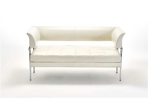Two seater sofa model "Hydra Castor". Produced by Poltrona Frau, Italy, recent production. Chromed metal structure and white leather upholstery. Bearing brand of production. (138x73x69 cm.) (slight defects)