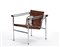 Poltroncina modello "LC1". Produzione Alivar, Firenze, disegno del 1928. Struttura in tubolare di acciaio, schienale e seduta rivestiti in cavallino, braccioli in cuoio. (cm 60x66x62,5) (lievi difetti)