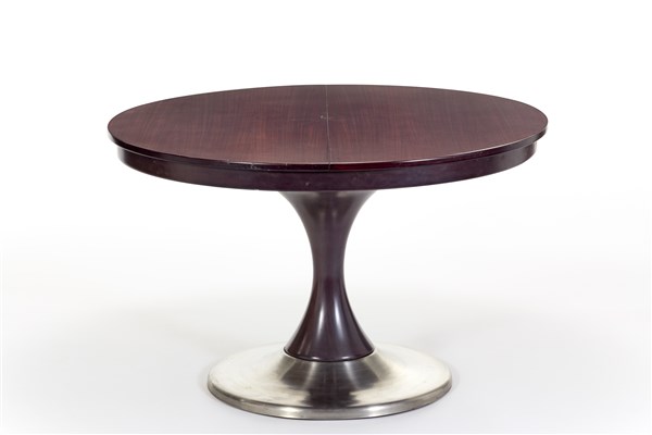 Tavolo da pranzo in legno scuro con piano circolare ampliabile, sostegno centrale tornito e base rivestita in metallo. Italia, anni '60. (tavolo chiuso: h cm 74,5; d cm 119,5) (lievi difetti)