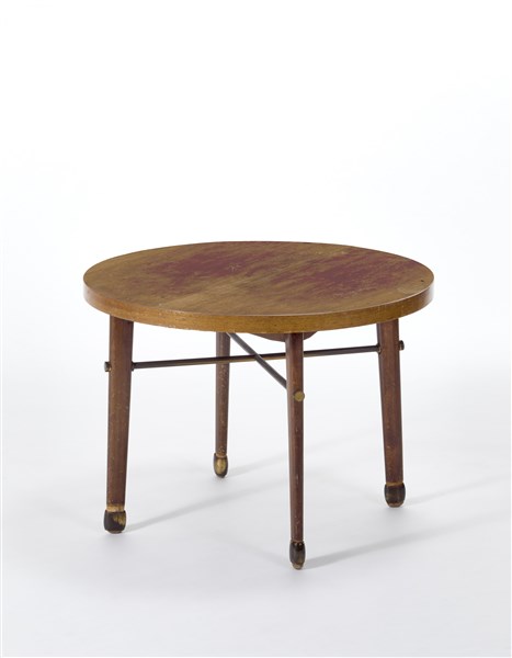Coffee table in solid teak wood and veneer with cross and brass tips. Italy, 1940s. (h 48 cm.; d 65.5 cm.) (slight defects)