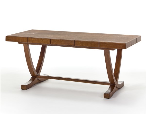 Tavolo in legno di rovere massello, bordato e impiallacciato con parti laterali a bugnatura liscia e gambe curvate incrociate. Italia, anni '30/'40. (cm 187x76x86,5) (difetti e restauri)