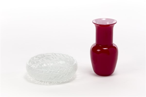 Lot consisting of a clear colorless glass bowl with lattimo murrine by Tobia Scarpa for Venini and a baluster vase in burgundy incamiciato blown glass signed and numbered pointed under the base "De Maio Murano 26722". Murano. (bowl: d 14.5 cm.; vase: h 15.5 cm.)