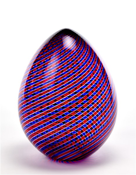 Uovo in vetro soffiato a canne ritorte blu, rosse e incolore. Murano, 1992. Firmato, datato e dedicato a punta sotto la base e recante etichetta adesiva. (h cm 30)