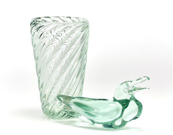 Lotto composto da un vaso costolato e una scultura a forma di anatra in vetro massello trasparente verdino chiaro. Murano, anni '50. (h max cm 29)