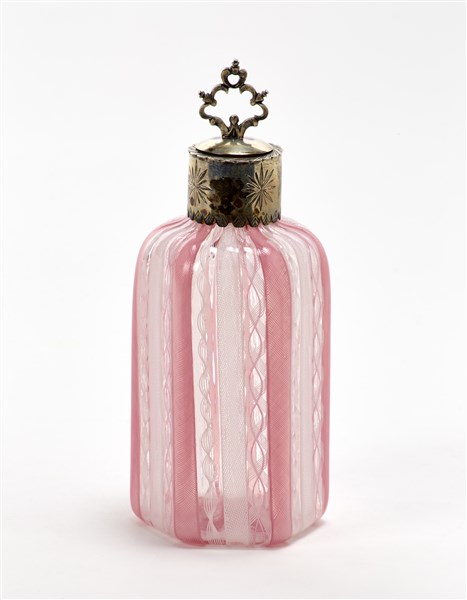 Bottiglietta portaprofumo in vetro soffiato trasparente incolore con canne di zanfirico rosa e lattimo, tappo in metallo argentato. Murano, anni '50. In scatola non pertinente. (h cm 20)