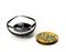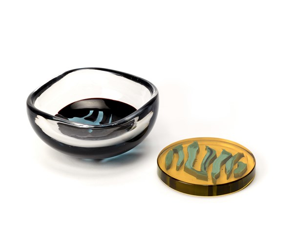 Lotto composto da una ciotolina e un tondo della serie "Mosche". Venini, Murano, 1978. Vetro trasparente incolore e ametista scuro e vetro soffiato giallo trasparente con inclusione di murrine verdi. (ciotolina: h cm 4,5; d cm 9; tondo: d cm 7)