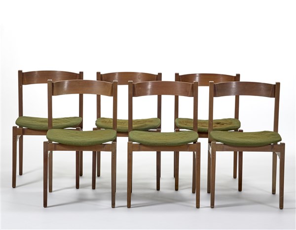Lot consisting of six chairs model "101". Produced by Cassina, Meda, 1959. Structure in wood, seat in green cloth. Bearing production label. (45.5x76x49.5 cm.) (defects)