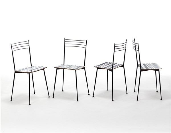 Lotto composto da quattro sedie della collezione "Ollo". Produzione Museo Alchimia, Milano, 1988. Seduta in legno multistrato rivestito in laminato bianco e nero Abet Laminati, struttura in metallo verniciato nero. (cm 36,5x80,5x38) (lievi difetti, piccole mancanze e modifiche)
