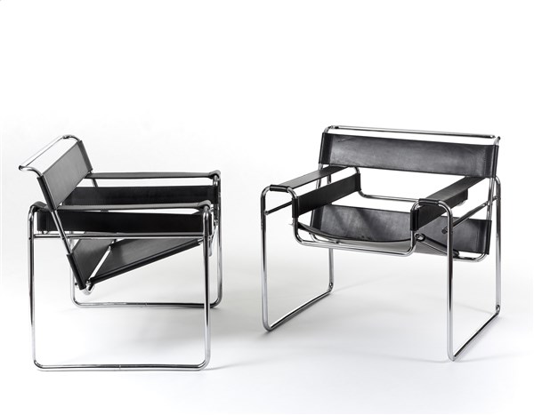 Coppia di poltrone modello "B3" o "Wassily". Produzione Gavina, San Lazzaro di Savena, anni '70. Tubo di acciaio cromato e cuoio nero. Recanti etichetta e firma incussa. (cm 78x72,5x65) (lievi difetti)