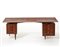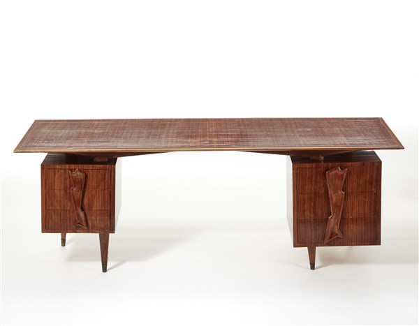Scrivania in legno massello impiallacciato e bordato a sei cassetti laterali con struttura a gambe rastremate con crociera sottopiano maniglie in legno intagliato dal profilo organico, puntali in ottone. Italia, anni '50. (cm 221,5x78x82,5) (lievi difetti)