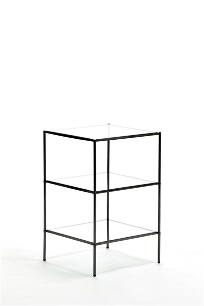 Tavolino a tre ripiani modello "T12 Montecarlo". Produzione Azucena, Milano, 1959. Ottone cromato con ripiani quadrati in cristallo molato. (cm 42x66x42)