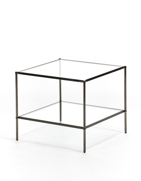 Tavolino a due ripiani modello "T12 Montecarlo". Produzione Azucena, Milano, 1959. Ottone cromato con ripiani quadrati in cristallo molato. (cm 54x46x54) (difetti)