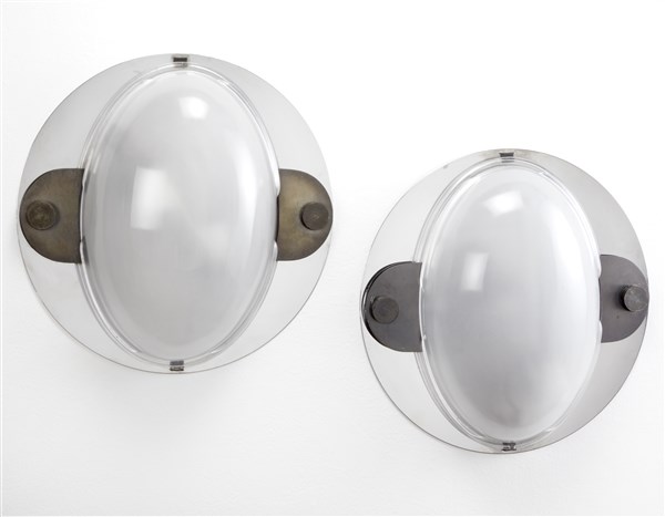 Coppia di lampade da parete modello "LSP12 Ovale". Produzione Azucena, Milano, disegno del 1982, esemplari della metà degli anni '80. Piastra in acciaio, vetro satinato ovale acidato internamente, borchie in ottone brunito. (d cm 46) (lievi difetti)
