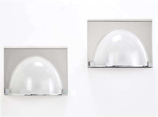 Coppia di lampade da parete a due luci modello "LP23 Mezzovale". Produzione Azucena, Milano, disegno del 1996. Struttura in acciaio e metallo cromato, paralume in vetro trasparente incolore acidato sulla superficie interna. (cm 33x23,5x12)