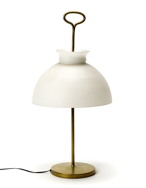 Lampada da tavolo modello "LTA4 Arenzano". Produzione Azucena, Milano, 1956. Ottone e vetro incamiciato opalino. (h cm 56) (lievi difetti)