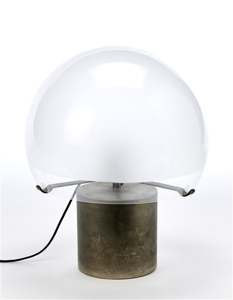 Lampada da tavolo modello "LTA6 Porcino". Produzione Azucena, Milano, 1967. Base cilindrica in metallo cromato, diffusore in vetro soffiato parzialmente acidato sulla superficie interna. (h cm 42; d cm 36) (lievi difetti)