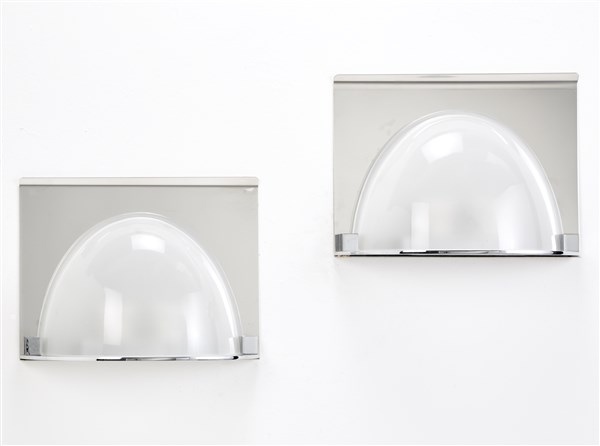 Coppia di lampade da parete a due luci modello "LP23 Mezzovale". Produzione Azucena, Milano, disegno del 1996. Struttura in acciaio e metallo cromato, paralume in vetro trasparente incolore acidato sulla superficie interna. (cm 33x23,5x12)